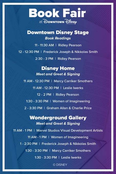 - The Downtown Disney Stage will play host to readings by authors Ridley Pearson, and Frederick Joseph & Nikkolas Smith of their titles Cautionary Tales, and Black Panther Wakanda Forever: The Courage to Dream.