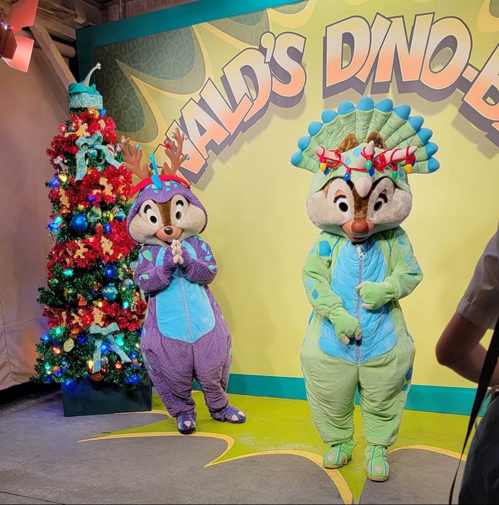 Chip and Dale’s Dinosaur costumes receive a little holiday flair for the season.