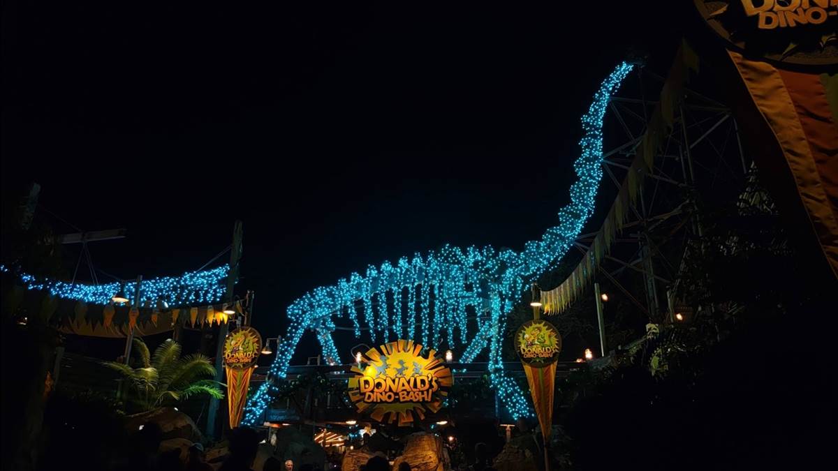 More festive fun can be found over in DinoLand U.S.A. where the Olden Gate Bridge is decked out as Santa Claus and covered in lights, making for quite the spectacle at night!