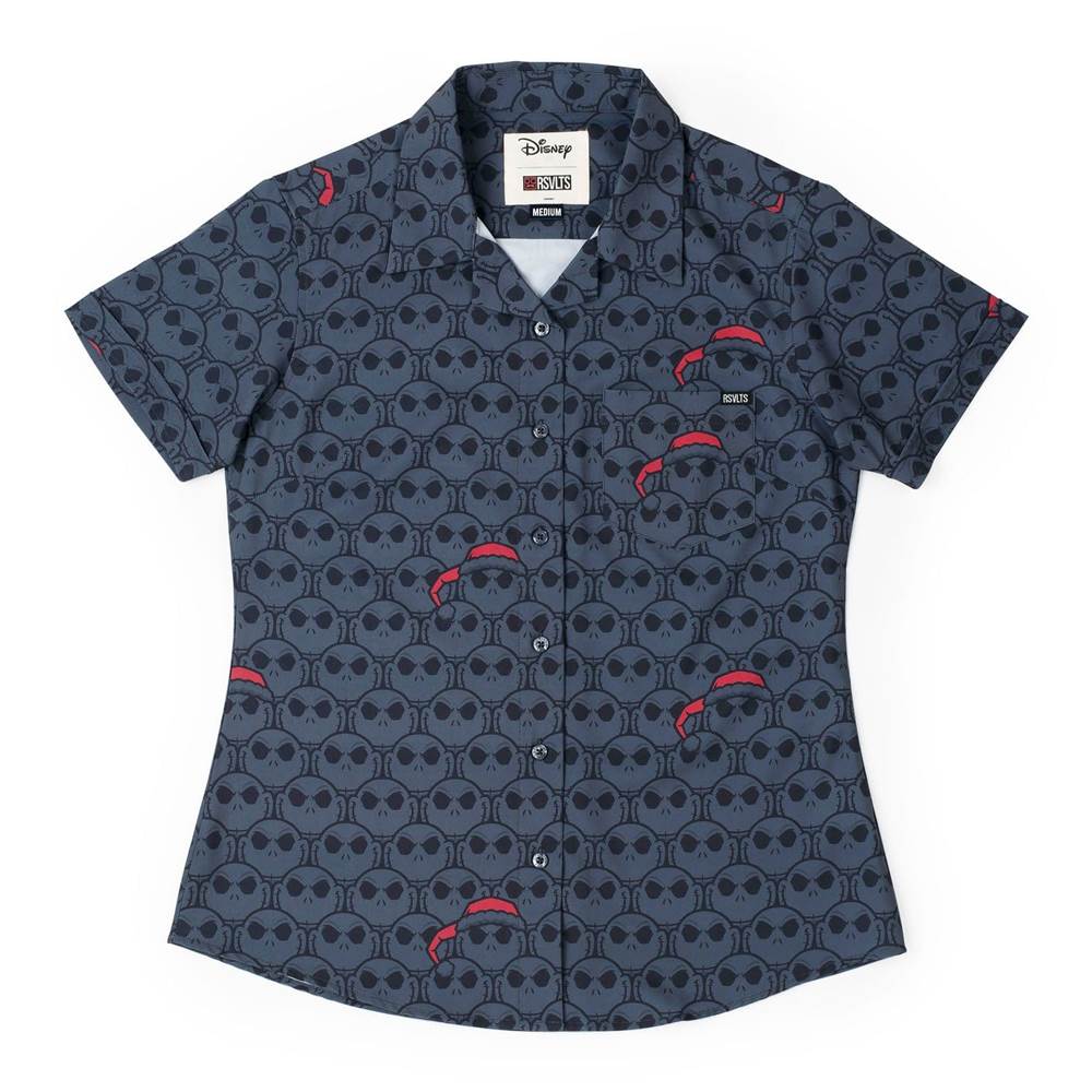“Make no bones about it, this menacing monochromatic button down is a not-so-friendly reminder of a little lesson a certain buggy burlap baddie learned the hard way: if you mess with Jack Skellington, your plan might soon… unravel. Ohhh, too soon?"
