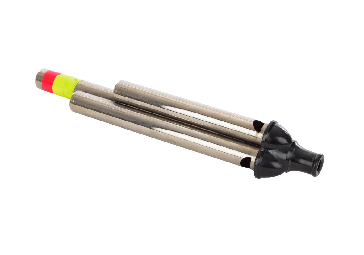 A photo depicts the whistle used for sound effects in Steamboat Willie, one of the historical artifacts that will be included in Disney100: The Exhibition. The whistle has been photographed against a neutral white background.