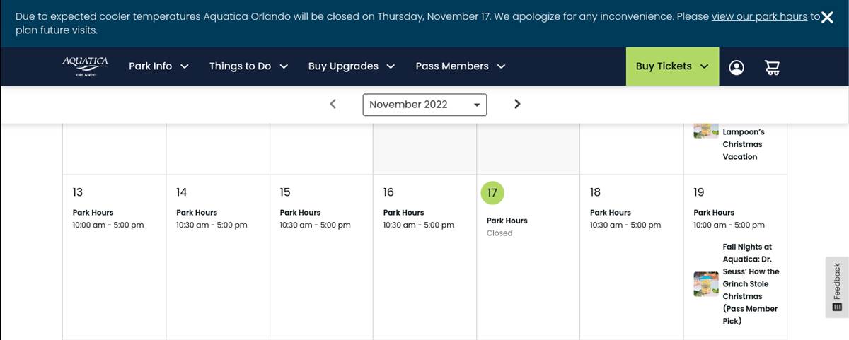 - Both Aquatica and Blizzard Beach have decided to close today, November 17.