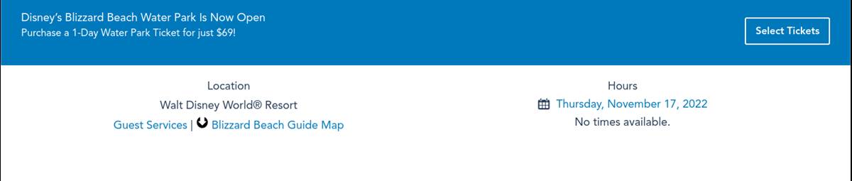 - According to the Walt Disney World website, Blizzard Beach will be closed both today, November 17, and tomorrow, November 18.