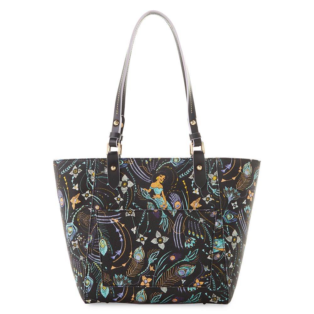 - As for the pattern itself, Jasmine’s full figure is featured sparsely, while colorful peacock feathers, flowers and ferns make up a majority of the look. It’s all set against a solid black background and the bags are finished with matching black piping.