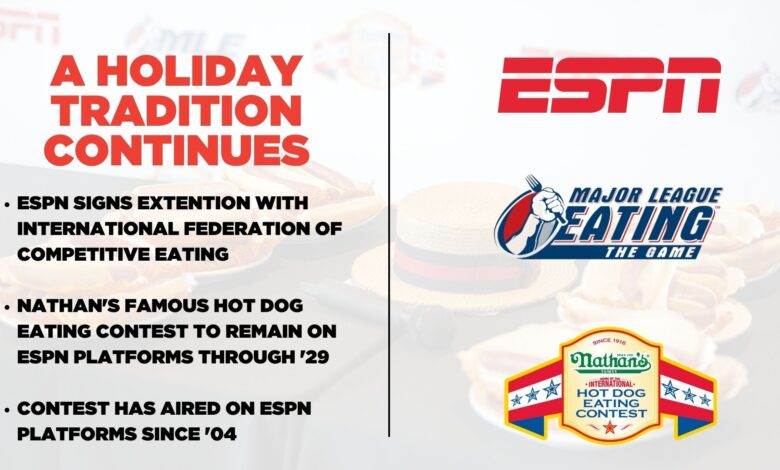 ESPN has announced an extension with the International Federation of Competitive Eating on a new, multi-year deal to keep ESPN as the exclusive domestic partner for the Nathan’s Famous Hot Dog Eating Contest through 2029.