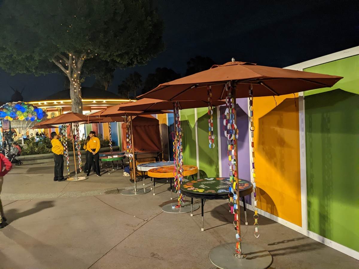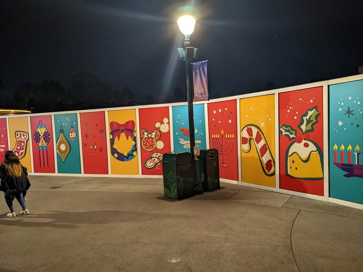 We begin on the western-most part of Downtown Disney, where the construction walls have received a festive overlay.