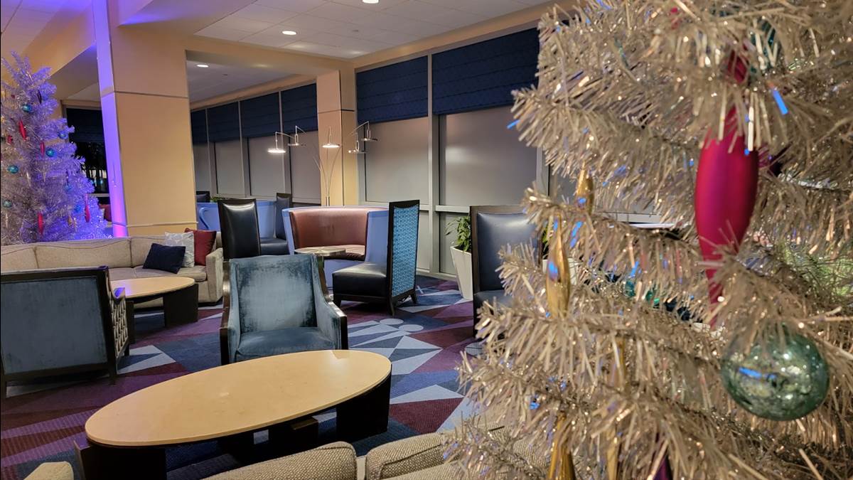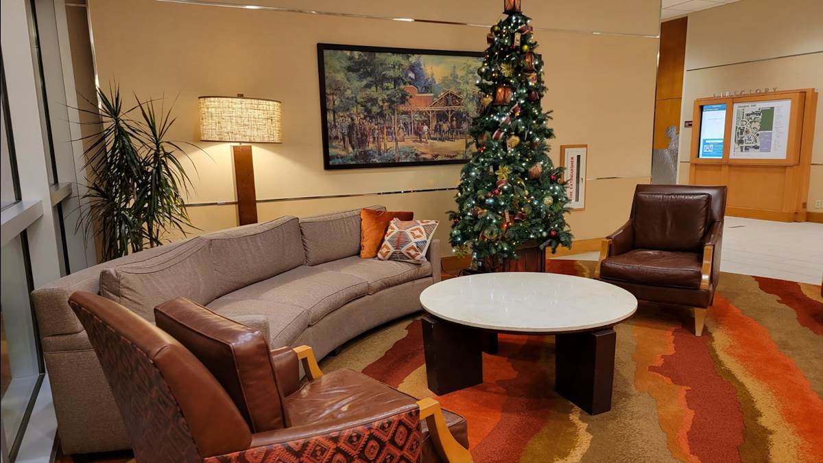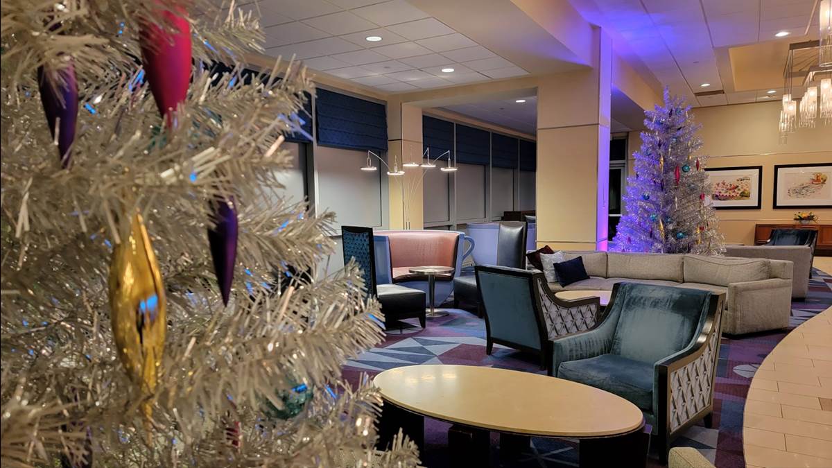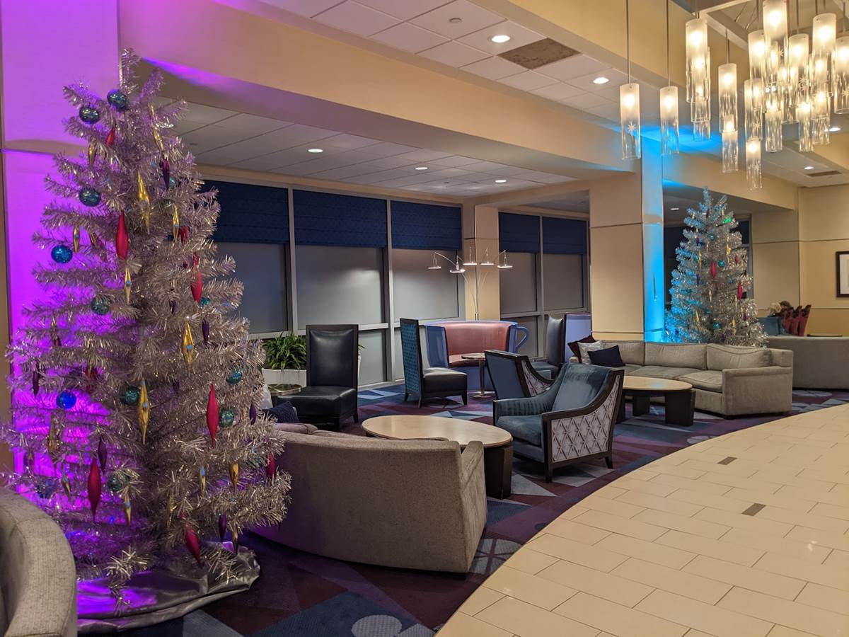 The different tower lobbies also feature festive decor. Take for example, the Frontier Tower. The comfortable seating area also features a tree that has western-themed ornaments on it, with a Frontierland-esque color scheme.