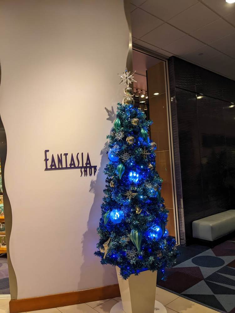 A similar tree can be found in the lobby of the Adventure Tower, though you won’t find Frontierland theming on the tree, you’ll find some Adventureland-esque decor. Ornaments look like tiki huts and drums, and a safari helmet sits upon the top of the tree.