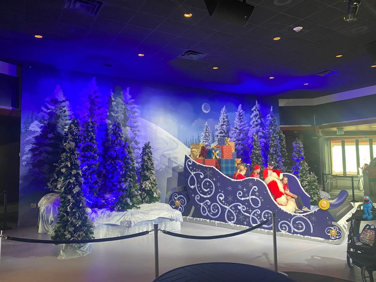 Santa gets a large sleigh and backdrop in the center of the Odyssey seating area.