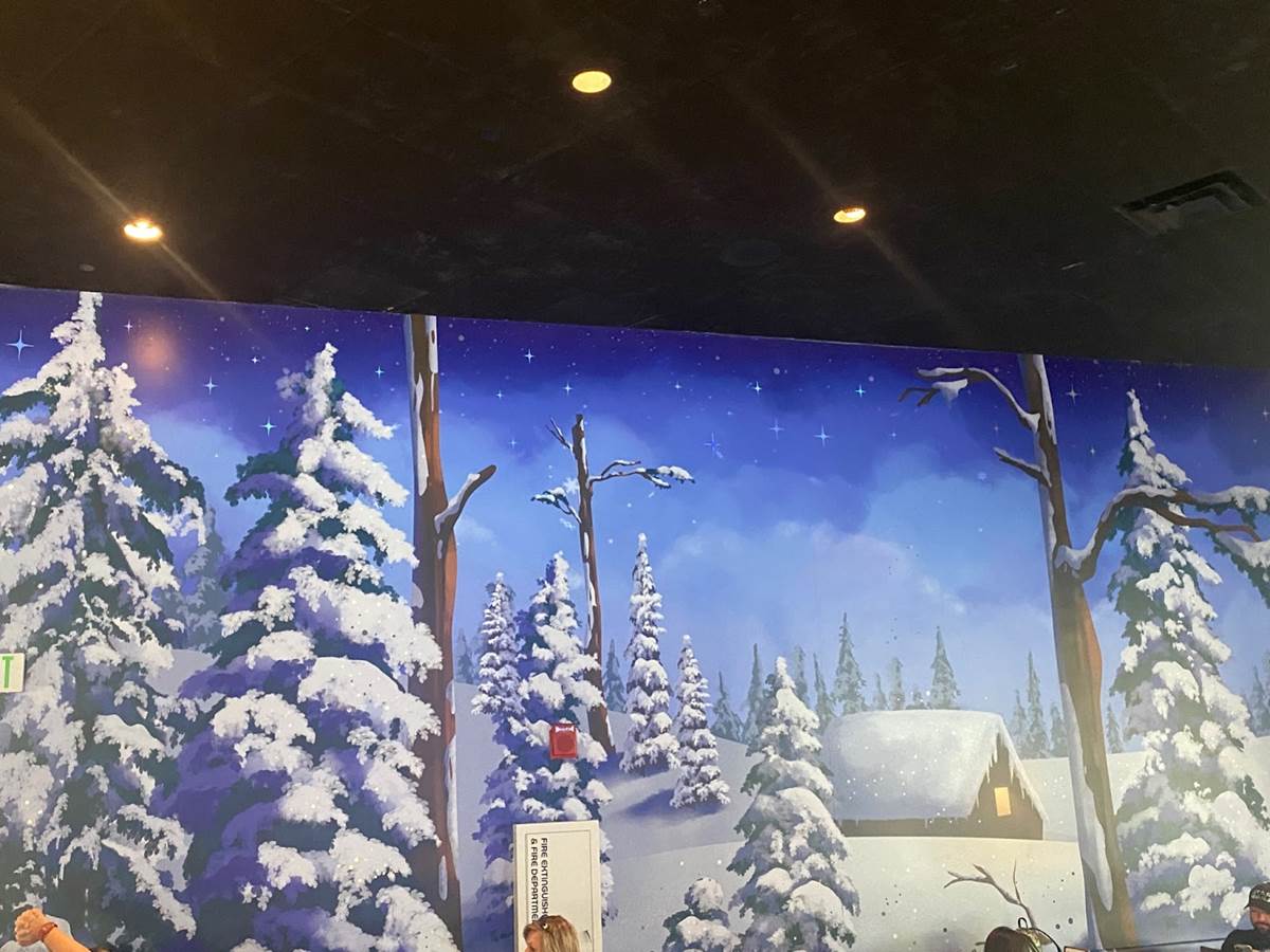 The walls within are decorated with paintings of snow covered trees, which also feature projections of falling snow.