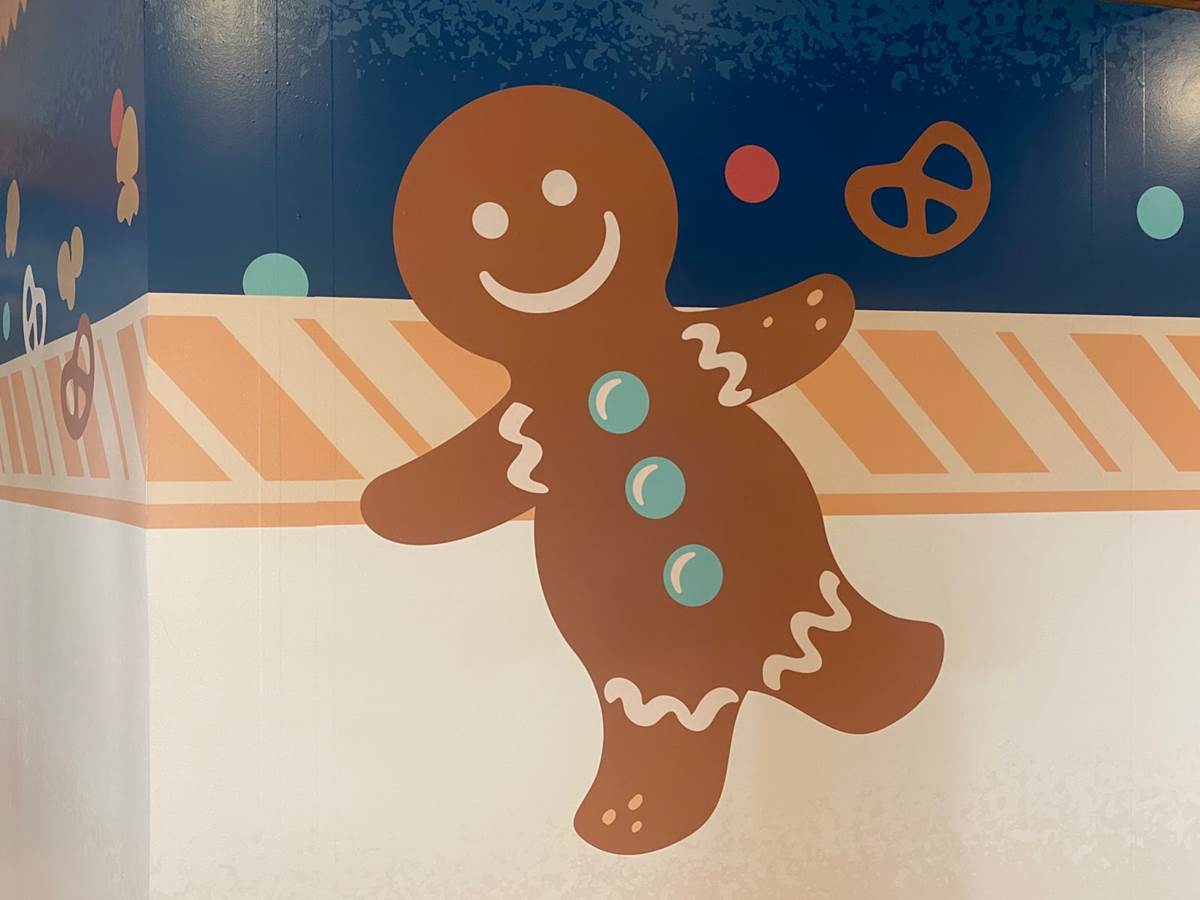 The walls are decorated with adorable gingerbread designs.