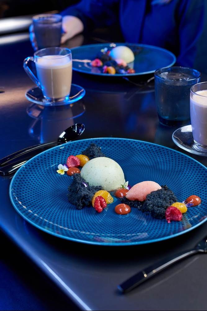 - Pistachio and Citrus - Pistachio Mousse, Charcoal Olive Oil, Blood Orange Sorbet and Sauce