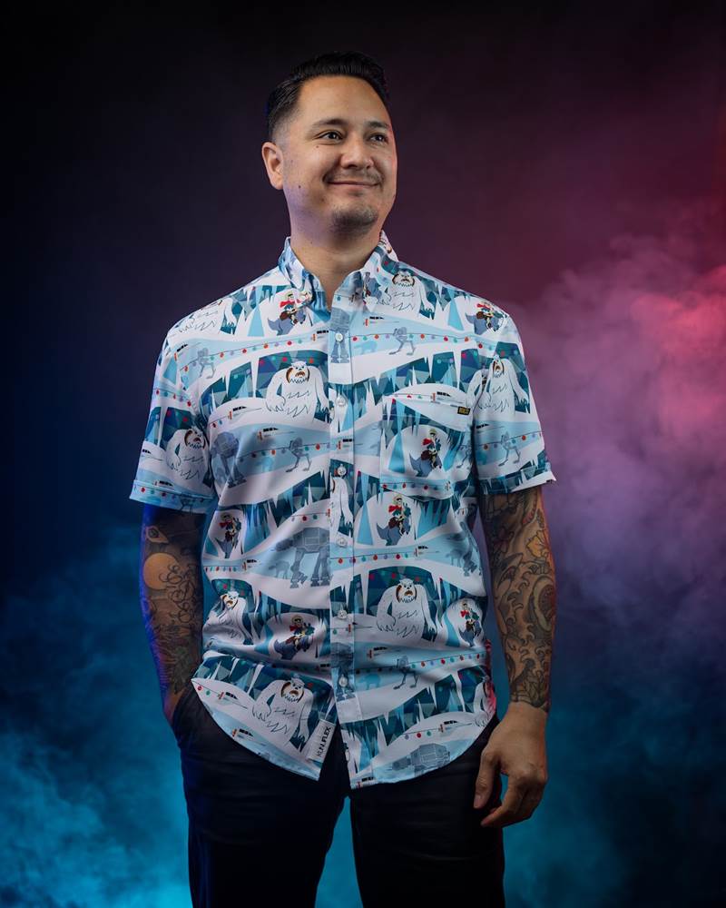Deck the Hoth and Rebel Crumb Shirts by RSVLTS ($70 each) - “There’s no place like Hoth for the holidays. Give yourself the gift of Star Wars with this soft and stretchy RSVLTS KUNUFLEX button down featuring a festively scarfed Han Solo, some merry snowspeeders, and a cute and cuddly Wampa just waiting to give you a hearty hug, of sorts. Available in long-sleeve, short-sleeve and women's styles. Pour yourself a cold glass of blue milk and take a bite out of the Empire with this soft and stretchy RSVLTS KUNUFLEX button down homage to two things that put everyone in a holly jolly mood: Star Wars and freshly baked cookies. Featuring gingerbread X-wings, TIE fighters, and Millennium Falcons, this delicious design is sure to make you the biggest hit in the galaxy this holiday season. Available in long-sleeve and short-sleeve styles."