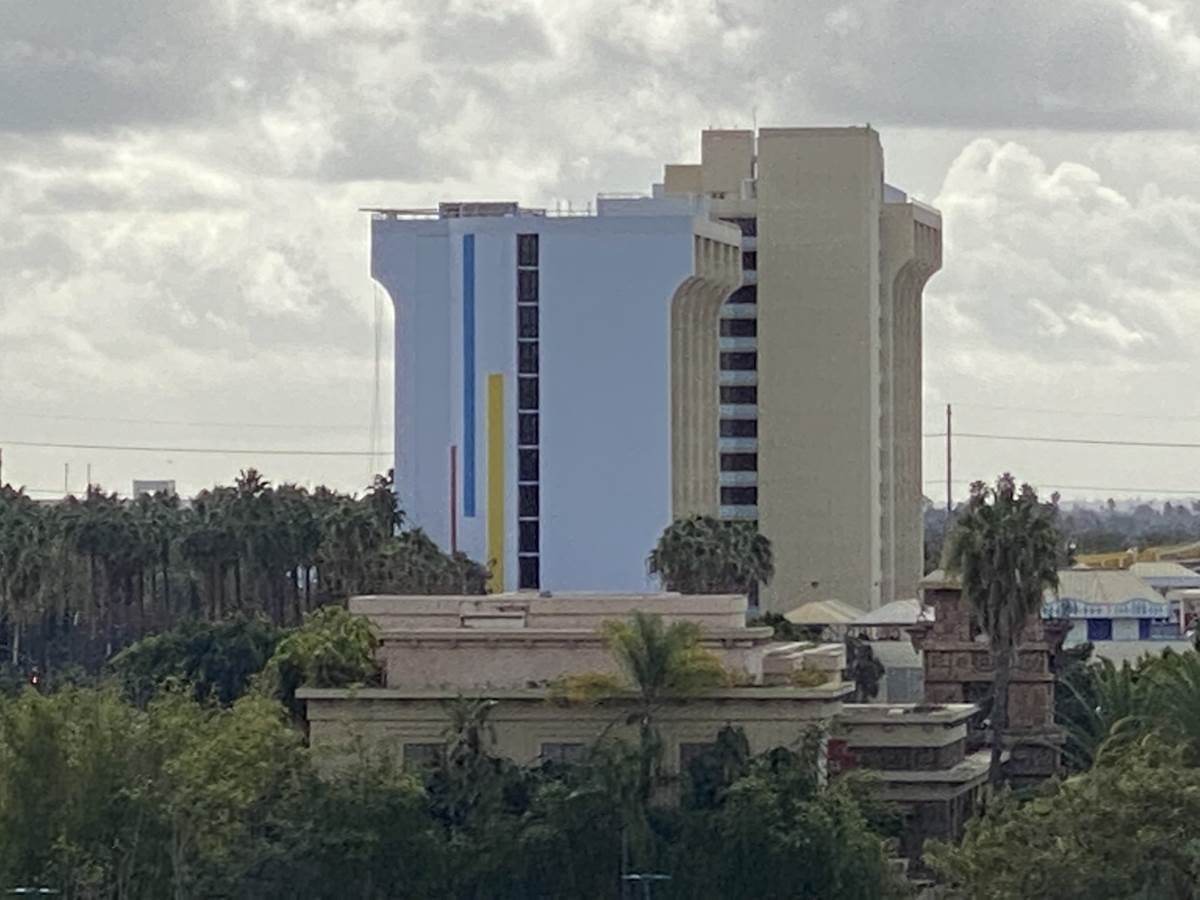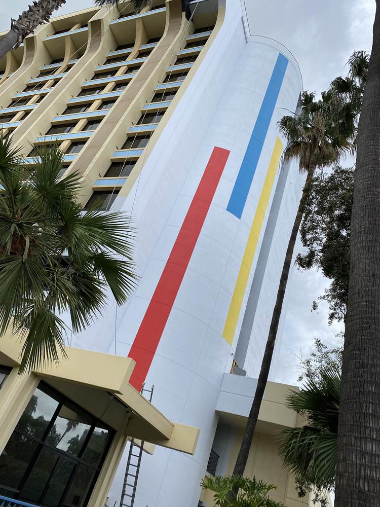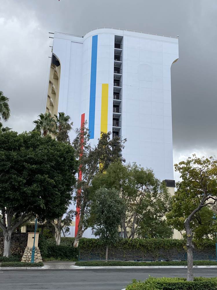 - Now, the side of the hotel facing Downtown Disney has received a new white color scheme, with different colored stripes running up and down.