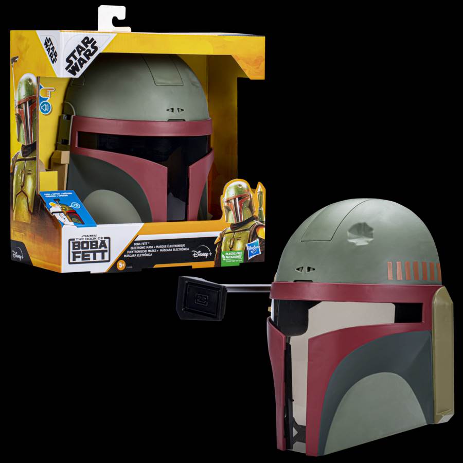 Boba Fett electronic mask from Hasbro ($44.99) - “"Imagine epic adventures and galactic duels with this BOBA FETT ELECTRONIC MASK! Kids ages 5 and up can channel one of the most fearsome and capable bounty hunters in the galaxy with this Star Wars mask, inspired by Boba Fett’s helmet in Star Wars: The Book of Boba Fett live-action series on Disney+. This mask features Boba Fett’s iconic rangefinder that moves up and down and a button on the side for sound effects and entertainment-inspired phrases like, ‘I want my armor back,’ ‘Lower your shields,’ and ‘Prepare for boarding.’"