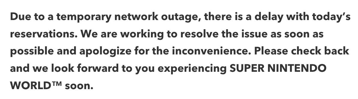 Pass Members looking to sign up for their exclusive preview of Super Nintendo World at Universal Studios Hollywood yesterday were met with a few hours of nothing, as the registration was delayed due to a network outage.