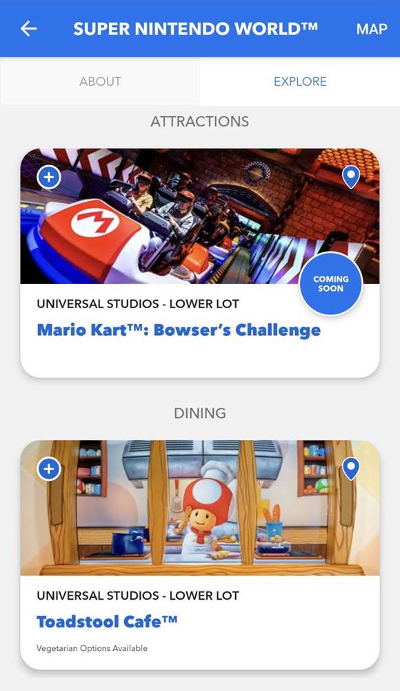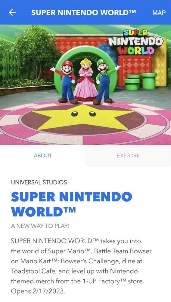 - Elsewhere, on the app, the individual pages are up for every element of Super Nintendo World, including:
