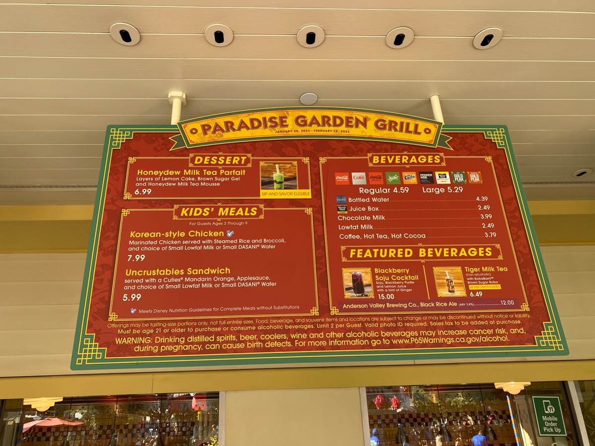 We begin in Paradise Gardens, where a small kiosk features a Teriyaki Turkey Leg and Baked Coconut Almond Nian Gao.