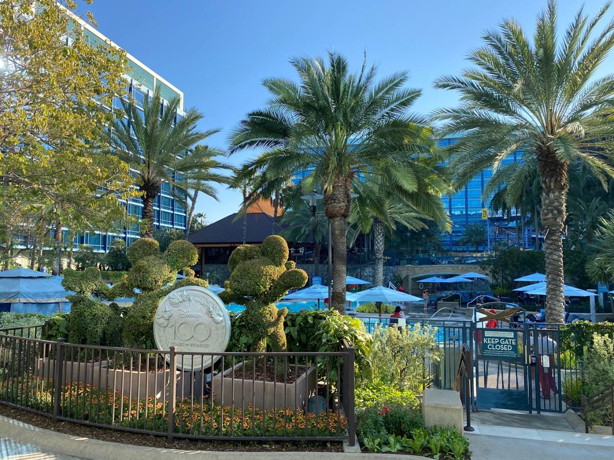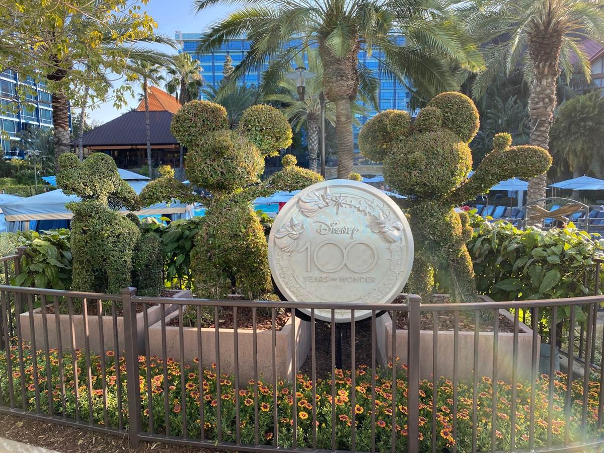- Meanwhile, over near the E-Ticket Pool, a Disney100 shimmering silver medallion has been placed between the Mickey and Minnie topiaries.