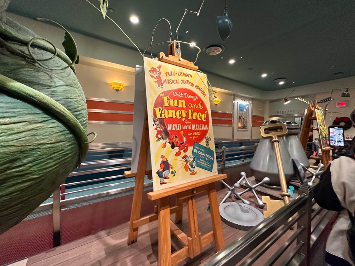 There’s even a giant beanstalk heading straight through the ceiling, from Mickey and the Beanstalk, part of the 1940s package film, Fun & Fancy Free.