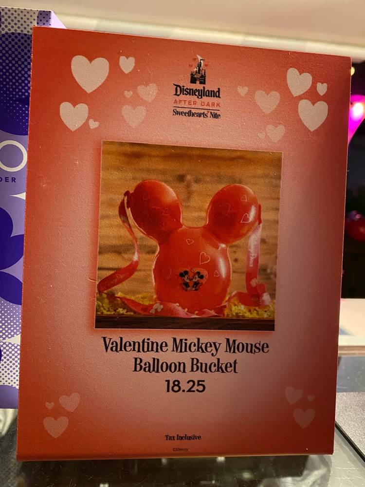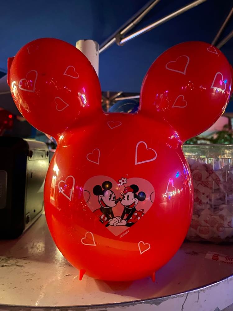 Popcorn lovers can get a romantic Sweethearts’ Nite balloon bucket featuring Mickey and Minnie.