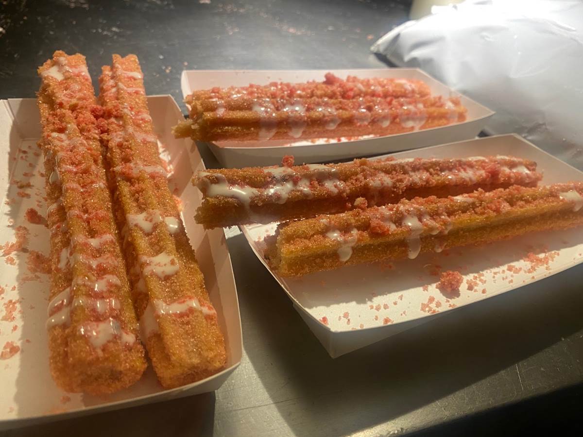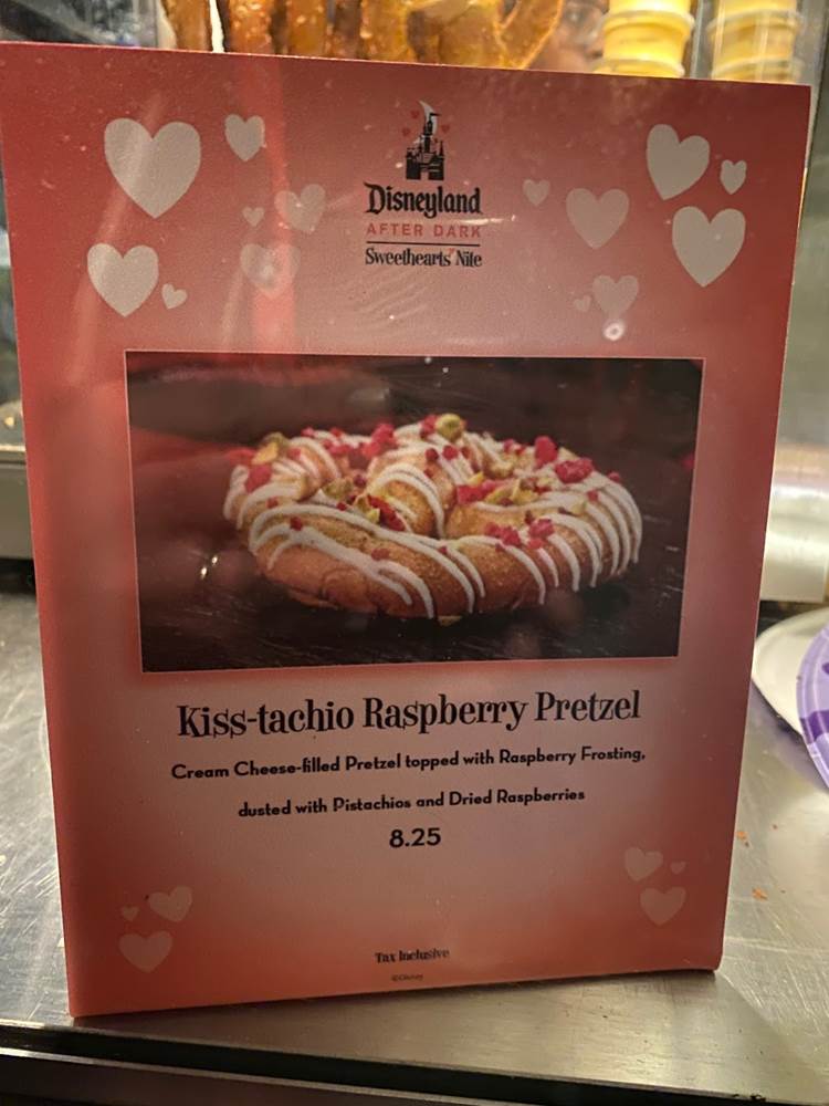 On to some of the special food items, such as the Kiss-tachio Raspberry Pretzel and a Strawberry Cheesecake Churro available in Tomorrowland.
