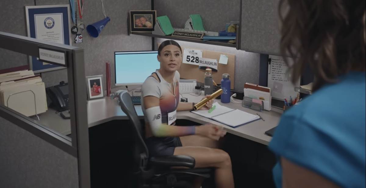 - Similar to the other recent creative, the commercials were filmed inside the ESPN headquarters in Bristol, Conn. Storm asks McLaughlin to catch up, but her schedule is pretty packed. McLaughlin replies with, “Yeah, I’ve got 51.46 right after lunch, or I’ve got 51.41 later this afternoon. Oh, wait, I have 50.68 right now!"