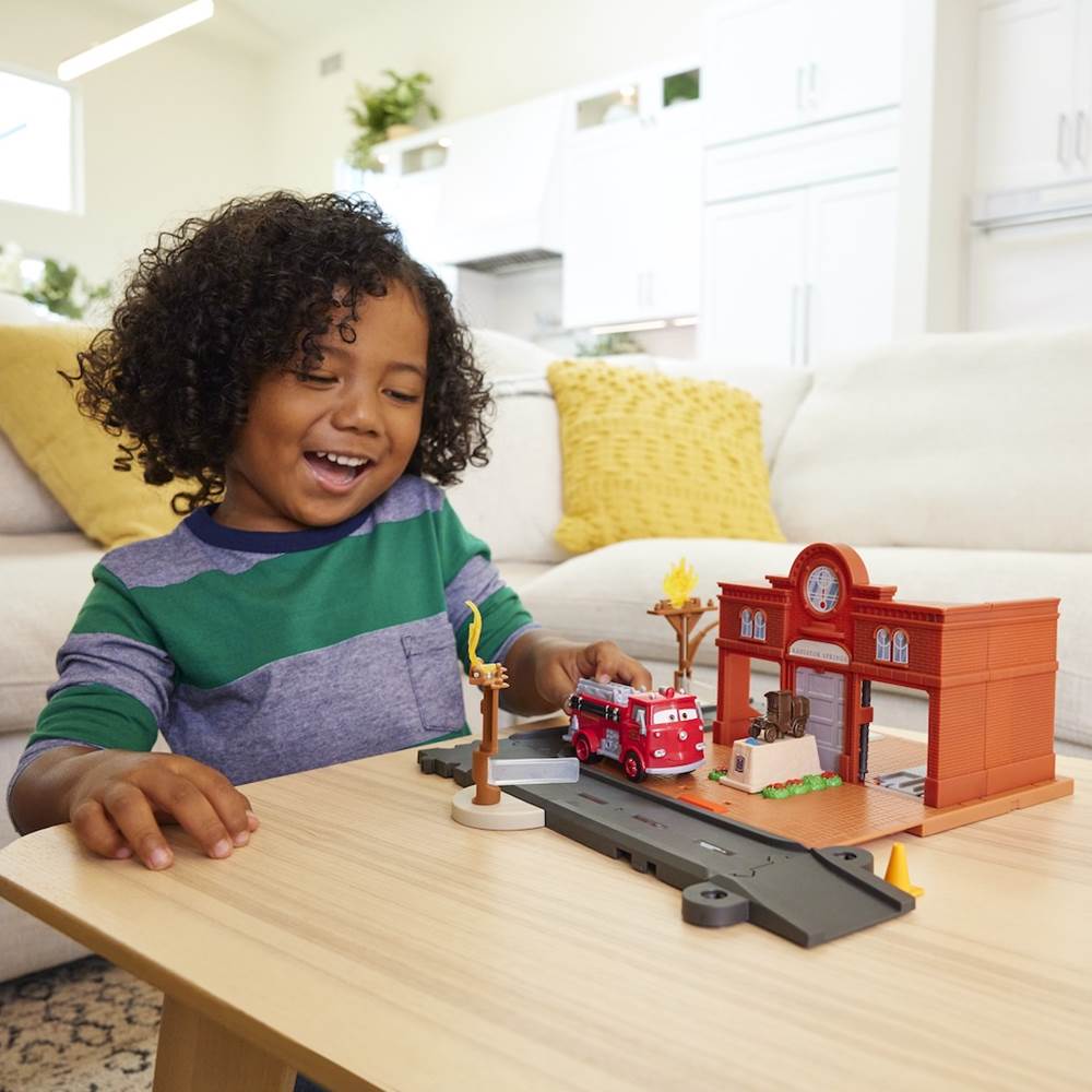Inspired by Cars On The Road, fan-favorite fire truck character Red takes pride in his fire station. Kids can help him race to the rescue, “filling up" his water tank and rolling into action with a lift-up ramp. You can also connect multiple playsets together to explore more of Radiator Springs (playsets sold separately).