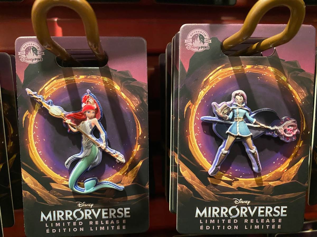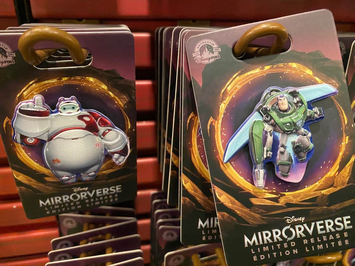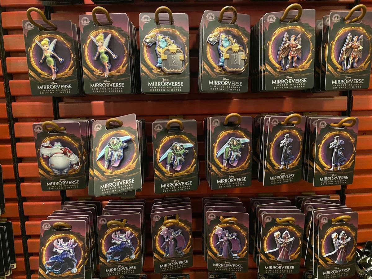 We spotted a wide variety of pins featuring Disney characters in their Mirrorverse outfits. Character pins we saw for sale include Mickey, Minnie, Donald, Ariel, Belle, Tinker Bell, Sully, Hercules, Baymax, Buzz Lightyear, Jack Skellington, Ursula, Maleficent and Jafar.