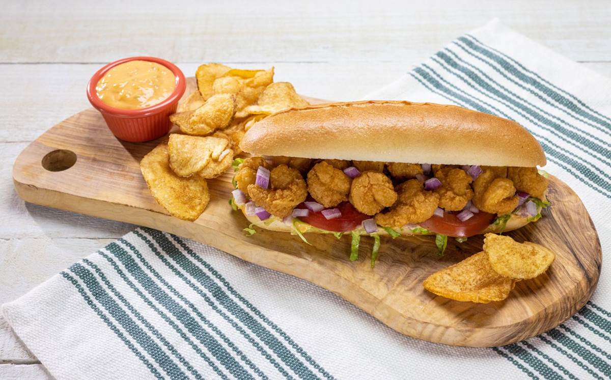 - Shrimp Po’ Boy with Zapps Chips – Crispy Cajun Fried Shrimp on a French Baguette, Topped with Creole Inspired Creamy Remoulade Sauce
