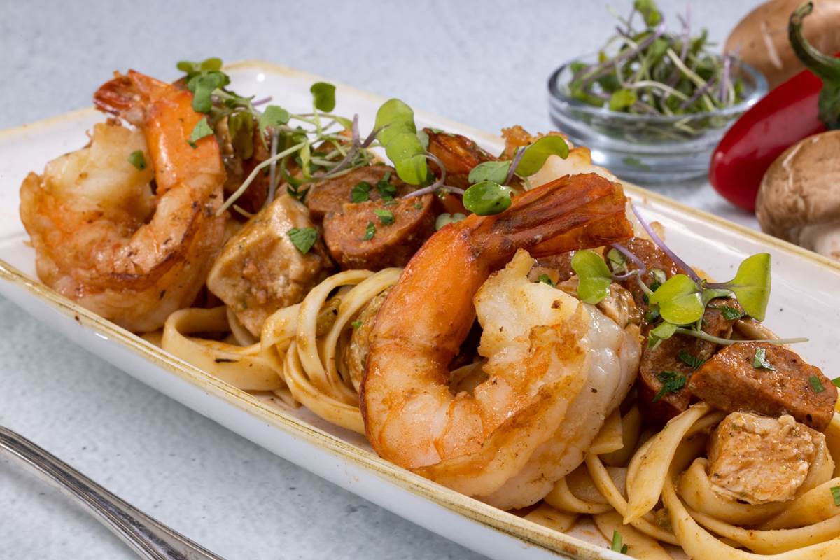 - Cajun Jambalaya Pasta – Shrimp, Smoke Sausage, Chicken, Onions, Peppers and Mushrooms in a Creole Sauce with Fettuccine Pasta