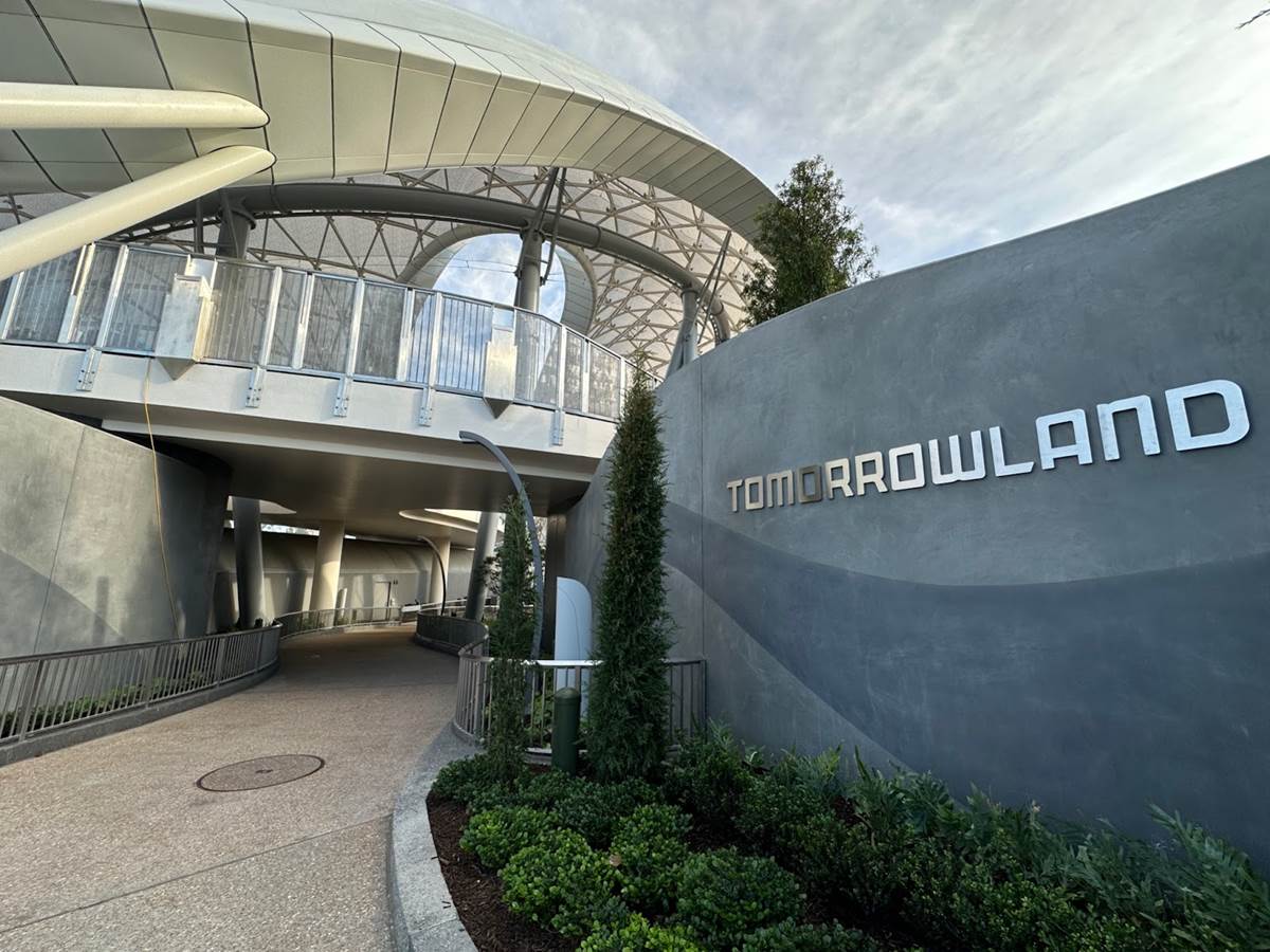 As guests approach TRON Lightcycle / Run from Storybook Circus, they’re greeted by this picturesque wall featuring a Tomorrowland logo.