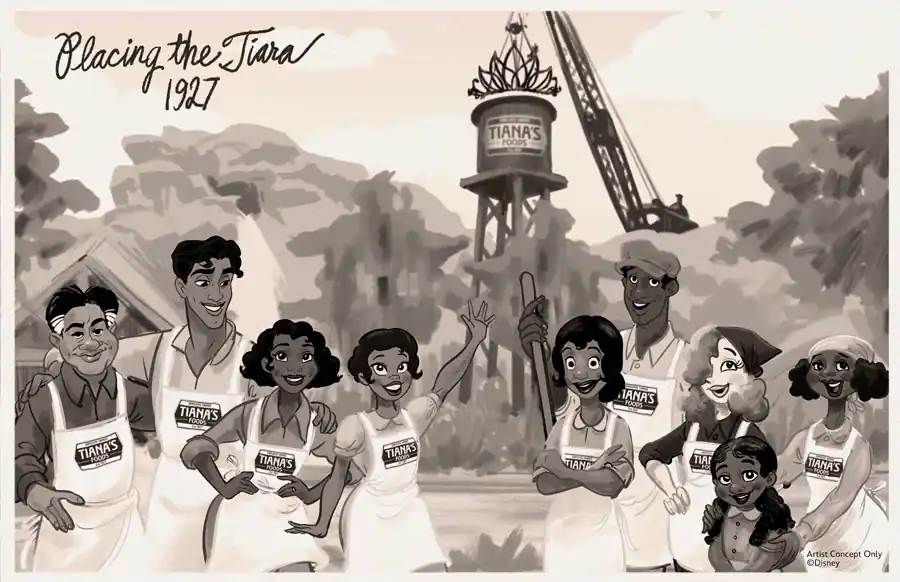 - Construction has begun for Tiana’s Bayou Adventure, and later this summer, a tiara-topped water tower emblazoned with the Tiana’s Foods logo will be at Magic Kingdom.