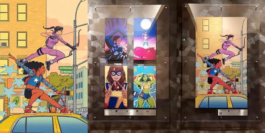 - For this exhibition, she crafted a connecting piece which features some of Marvel’s greatest heroes such as She-Hulk, Scarlet Witch, Captain Marvel and more. When all covers are laid side-by-side, they create one complete piece of artwork.