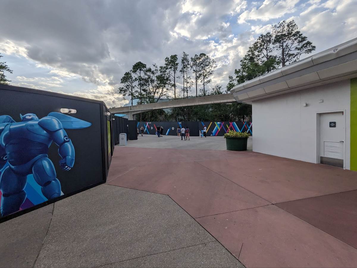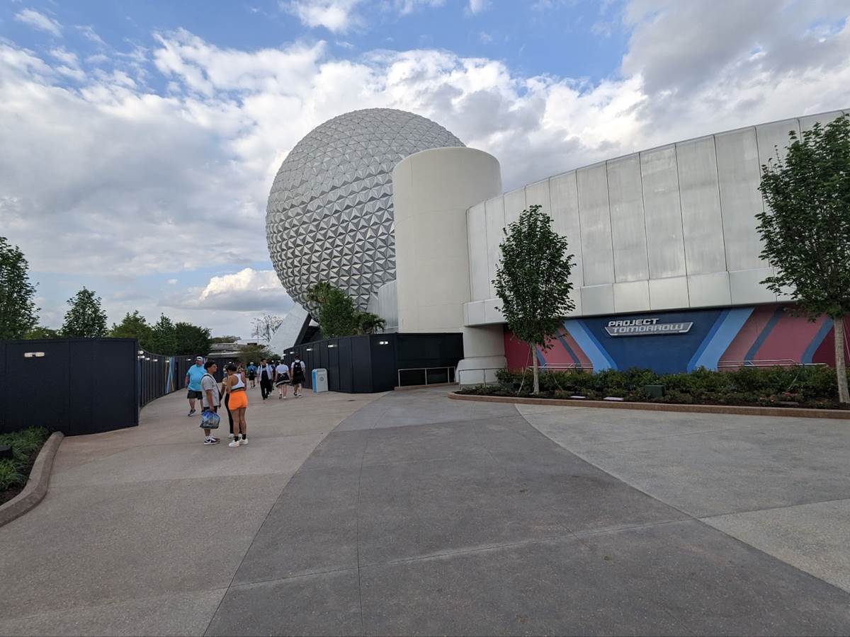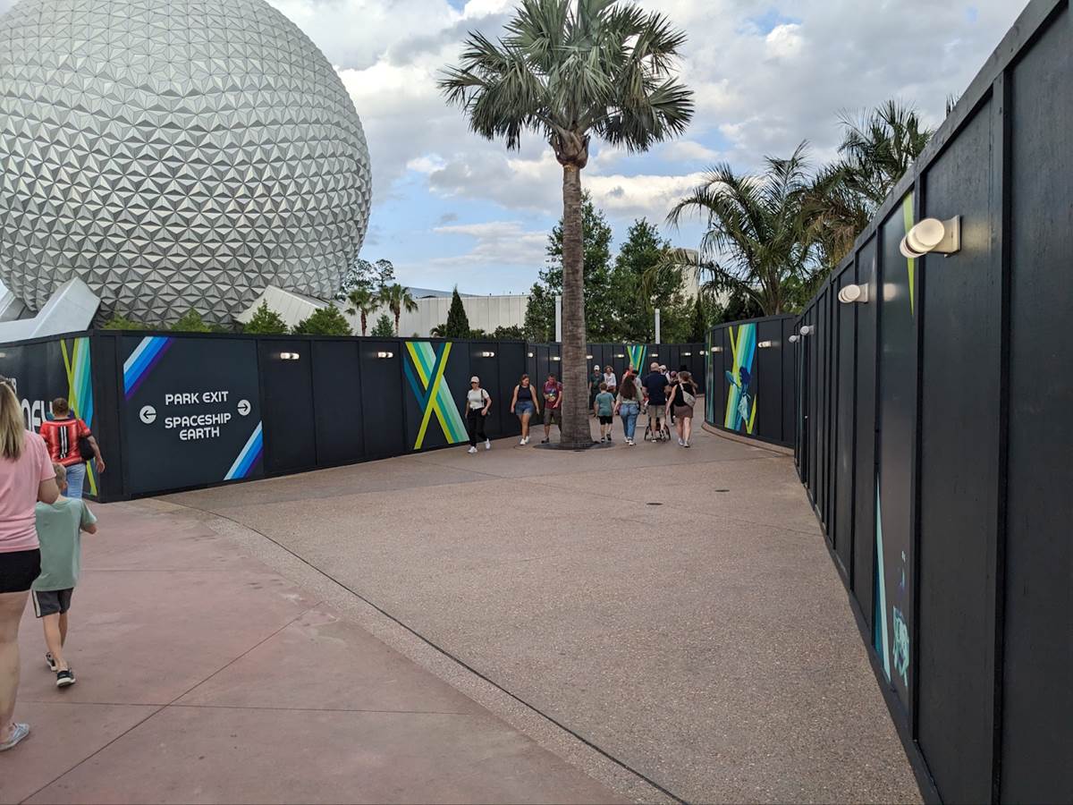 The pathway opens up to the west exit of Spaceship Earth, which has been blocked off for many months now.