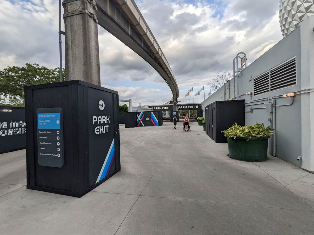 From here, guests can proceed under Spaceship Earth and towards the park exit.