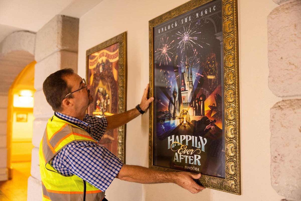 - In these photos shared by the Disney Parks Twitter account, an Imagineer is shown placing the Happily Ever After attraction poster in the train tunnels at the entrance to Main Street, U.S.A.