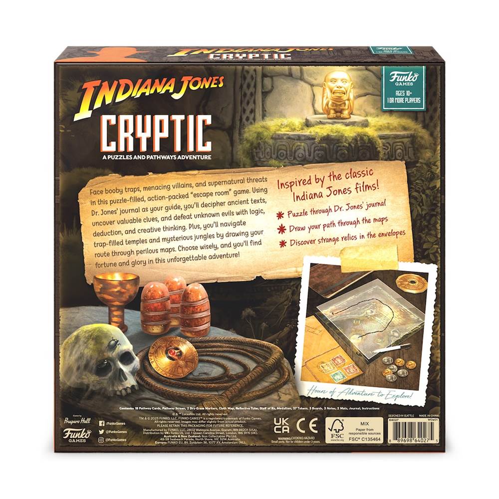 - Indiana Jones Cryptic is the first in an innovative new interactive mystery game line of “Puzzles and Pathways Adventures" from Funko Games. Players will follow clues from Dr. Jones’ journal to solve a wide variety of intricate challenges across three separate adventures based on the first three films, using their logic, deduction, and creative thinking all while avoiding traps and enemies along the way!