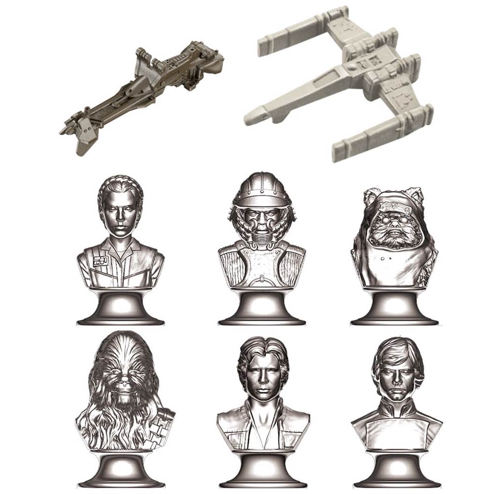 - The games comes with a gameboard, 6 character tokens, 6 Character Power cards, 28 Title Deed cards, 16 Rebel Alliance cards, 16 Galactic Empire cards, 32 Speeder Bikes, 12 X-Wings, 2 dice (1 numbered die, 1 Rebel die), money pack, and game guide.