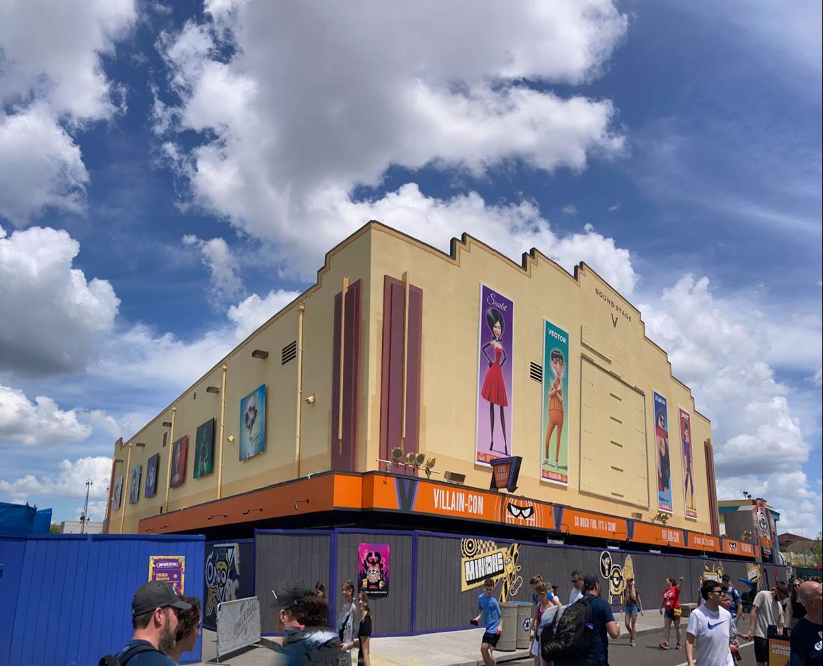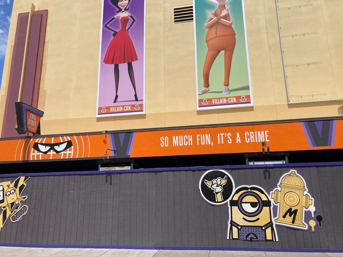 - Since our last update in March, the attraction’s entrance has seemingly been completed, with a big Villain-Con marquee.