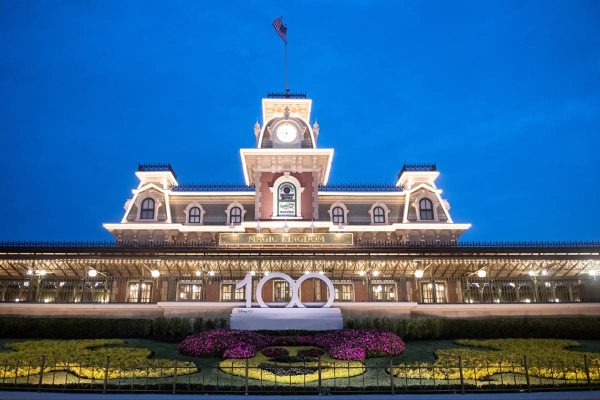 - Last night, a new platinum Disney100 marquee was installed in front of the Main Street Train Station at the entrance to the Magic Kingdom.