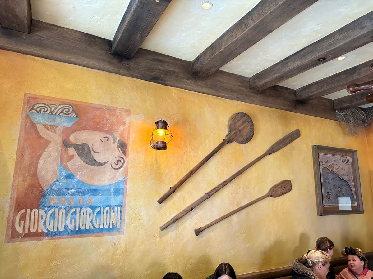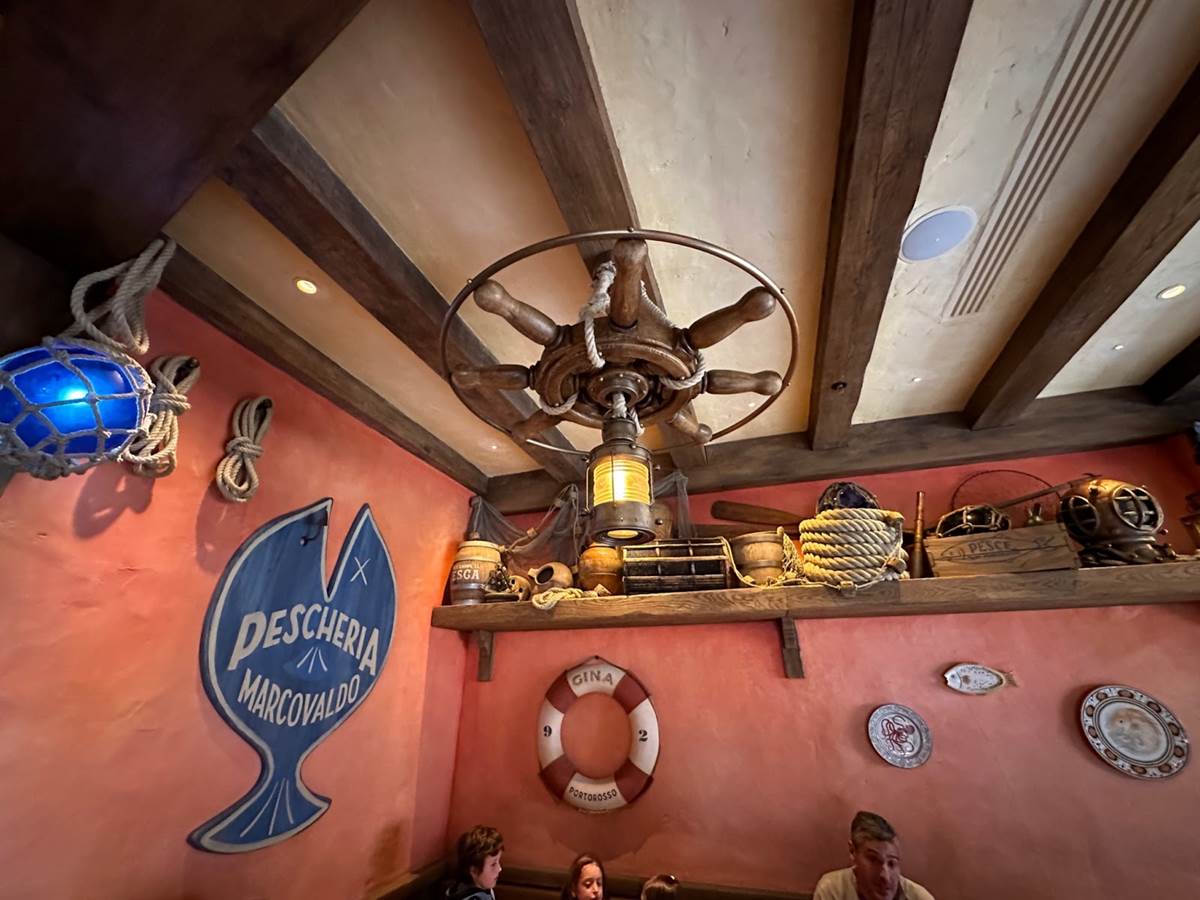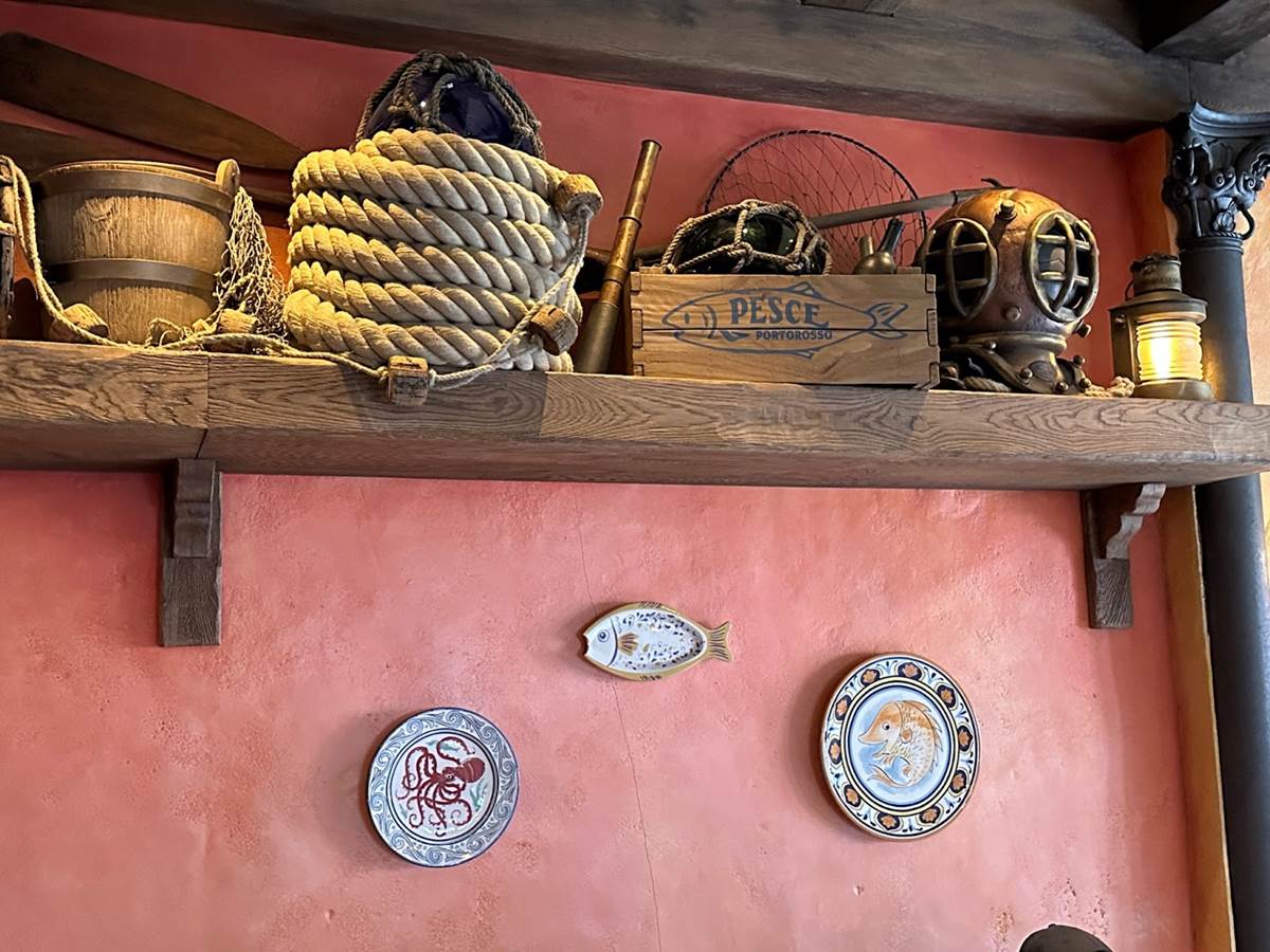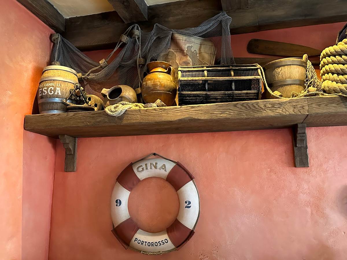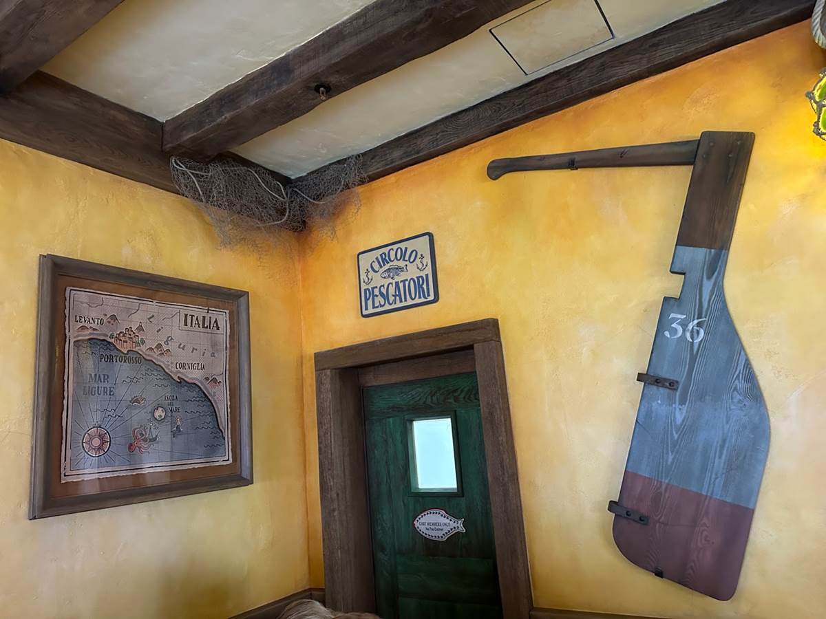 Attention to detail is everywhere, with more than 60 props and accessories specifically created for this new space, all centered around the local fishing culture and cuisine. This of course includes all of Chef Massimo's favorite pasta-making ingredients and cooking utensils. Guests will also spot the diving helmet used by Luca to win the Portorosso Cup race.