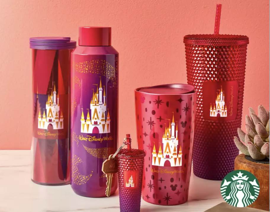 - Disney fans can show off their affinity for Starbucks and their favorite resort with this series that combines pretty purple and red jewel tones with a white and golden-yellow castle.
