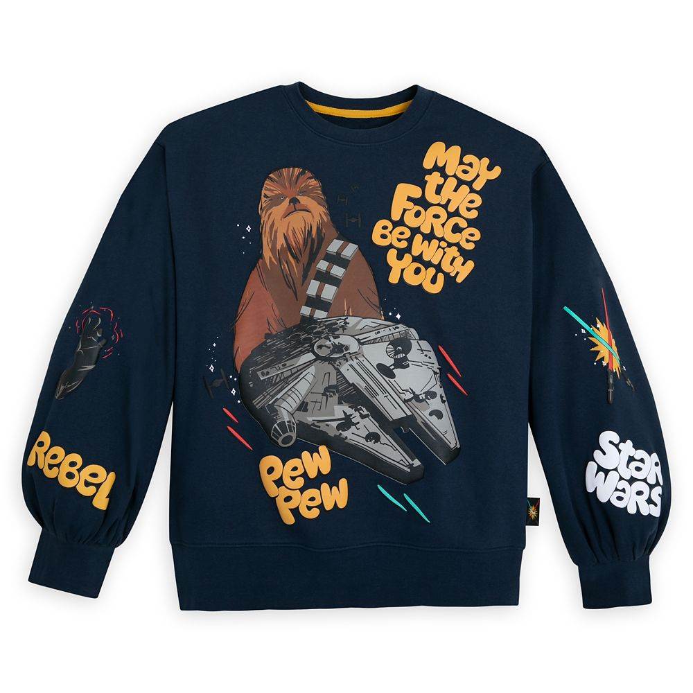 Get cozy for a movie marathon of your favorite trilogy in this soft Star Wars Meets the ‘90s Pullover Sweatshirt, decked out in phrases and icons like “May the Force Be With You," Chewbacca, and the Millennium Falcon.