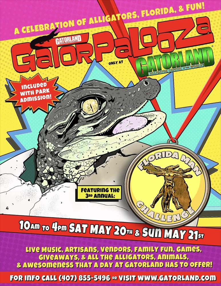 - Mark McHugh, President and CEO of Gatorland: “We are so excited to host our Gatorpalooza festival again for the 4th year, and roll out Gatorland’s unique style of fun and excitement during this special weekend event. Gatorland is filled with more alligators than any other attraction in Florida, but it’s also filled with crazy ‘Florida-Style Entertainment,’ too! Now you can see both in action with our 3rd Annual Florida Man Challenge! On Saturday May 20th, watch as our brave and somewhat crazy competitors climb into giant inflatable Zorb balls and race through a real swamp swarming with giant alligators! It’s the kind of sporting event that makes the rest of the world shake their heads and say ‘Only in Florida,’ while everyone in Florida just shakes their heads and says, ‘Only at Gatorland!’"