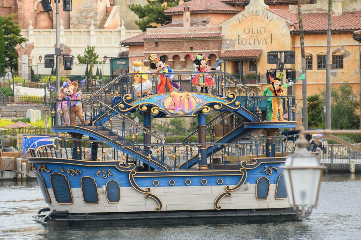 Let’s Celebrate with Colors, a new show created just for the 40th anniversary, features Mickey Mouse and friends on the waters of Mediterranean Harbor at Tokyo DisneySea.