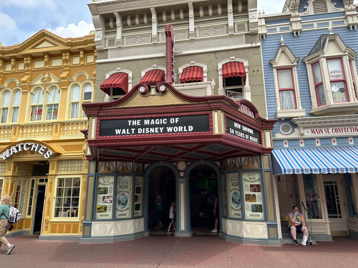 The marquee for the Main Street Cinema still reads “The Magic of Walt Disney World." Inside, Walt Disney World logo merchandise can now be found, as well as a wide variety of mouse ears and hats.