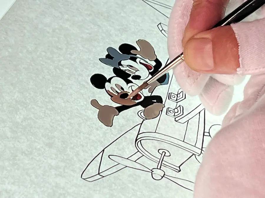- Each cel was hand-inked and hand-painted using Disney-approved acrylic colors based on an original drawing created by legendary animator, director and Mickey Mouse aficionado, Eric Goldberg.