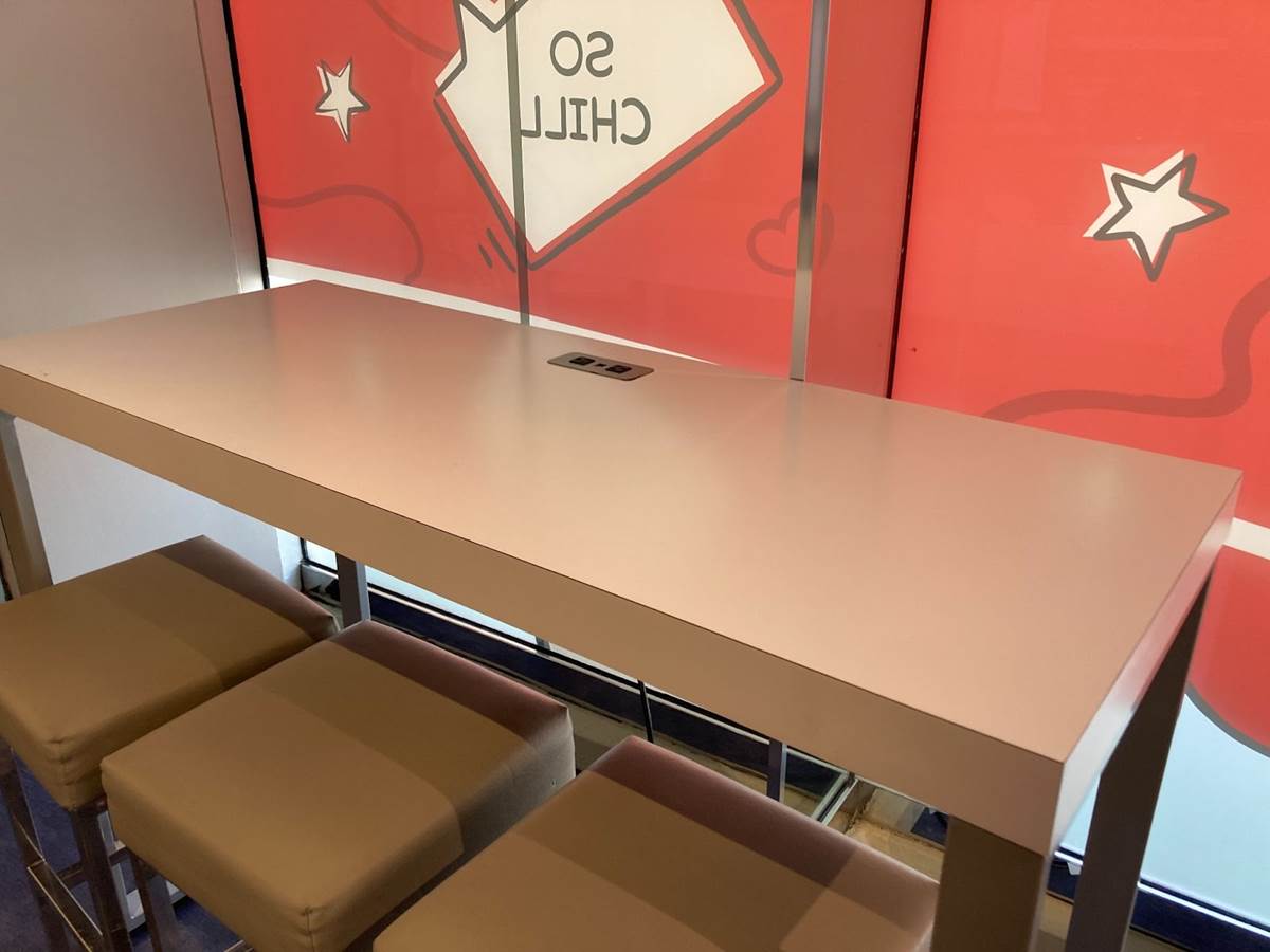 - There are also multiple tables with built-in outlets and USBs for those who need to charge up their devices.