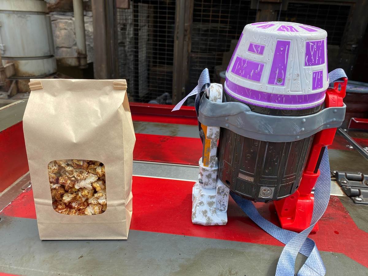 - Visitors to Star Wars: Galaxy’s Edge can get their hands on the latest popcorn bucket to arrive at the Disneyland Resort, this one themed to spare droid parts that make up a popcorn vessel.